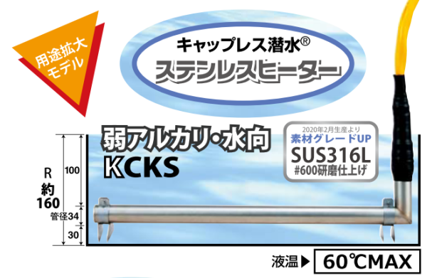 潜水ヒーターシリーズは防水投げ込みヒーターとは異なり、本体を液中に沈めて使用できる構造です。