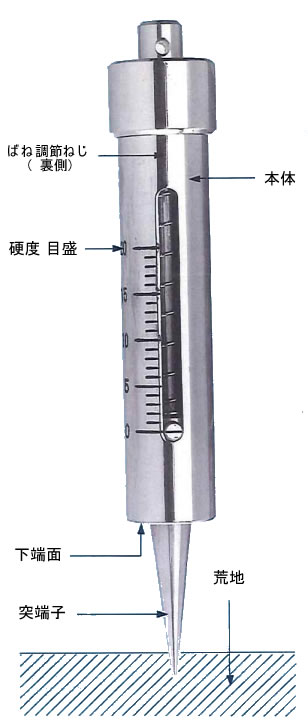 - 荒地につきさすだけの極めて簡単な使用法で、硬度(=水分量)が正しくわかり、熟練が要りません。